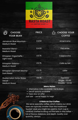 Welcome to Rasta Roast coffee shop where every cup is a celebration of heritage, harmony, and the Rastafarian spirit. We combine the rich, earthy flavours of premium coffee with the vibrant, soulful essence of Rastafarian culture.